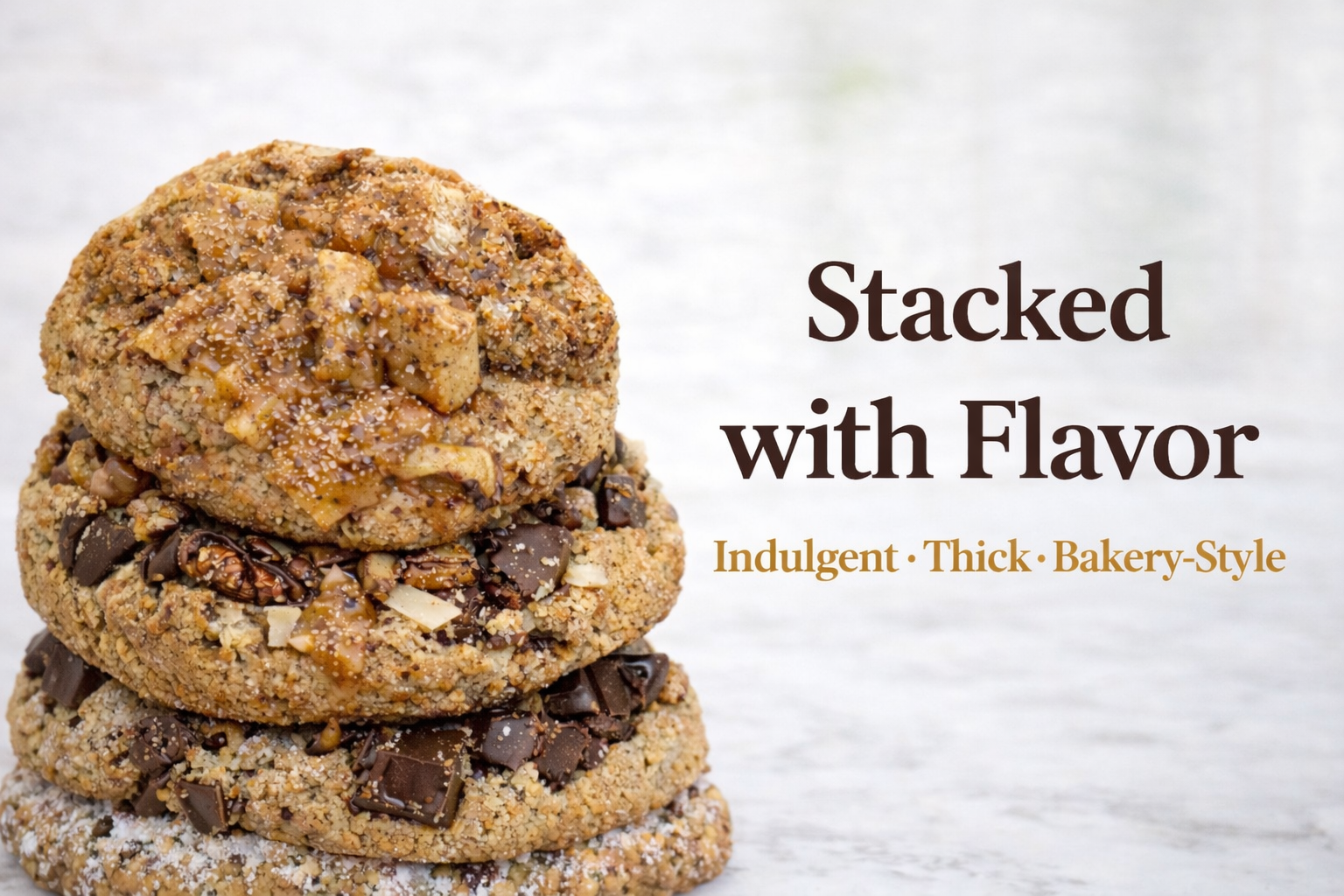 Our cookies are made the old-fashioned way — from scratch, in small batches, using real ingredients. Soft in the center, perfectly baked on the edges, and loaded with rich flavors, every cookie delivers that comforting, just-out-the-oven taste you know and love. From classic chocolate chip to indulgent double chocolate and cozy apple cinnamon, each bite feels like home.